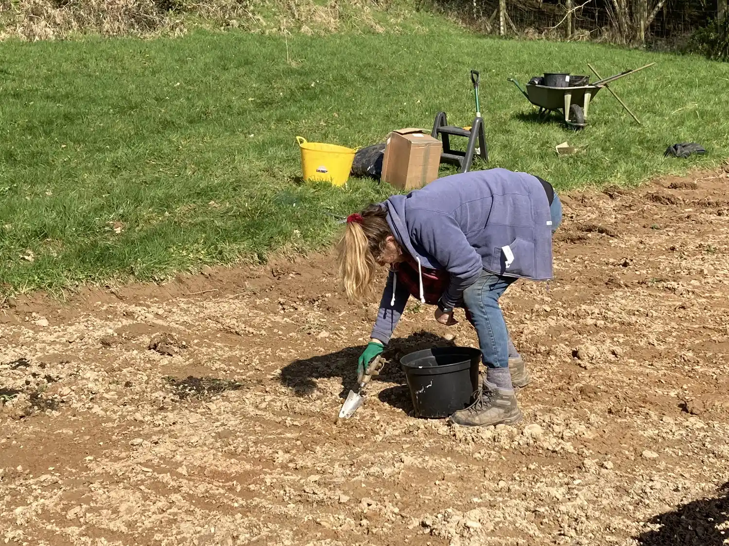 We chose a spot in the field which was in a sunny position and then decided on the shape and size and put stakes in ready for the bed to be dug out.